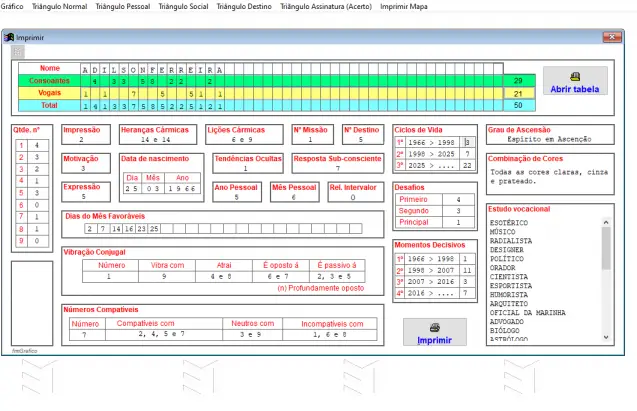 Esta é a tela mais importante do sistema. Item a item criamos o algoritimo que nos daria o valor exato e correto de cada item do mapa. Dava início à saga de criar uma ferramenta que fosse intuitiva para ser usada pelo numerólogo com experiência ou mesmo pelo numerólogo recém formado. Centenas de horas de desenvolvimento e testes com todos os tipos de nomes possíveis. E é claro tivemos a ajuda de outros numerólogos nestes testes.